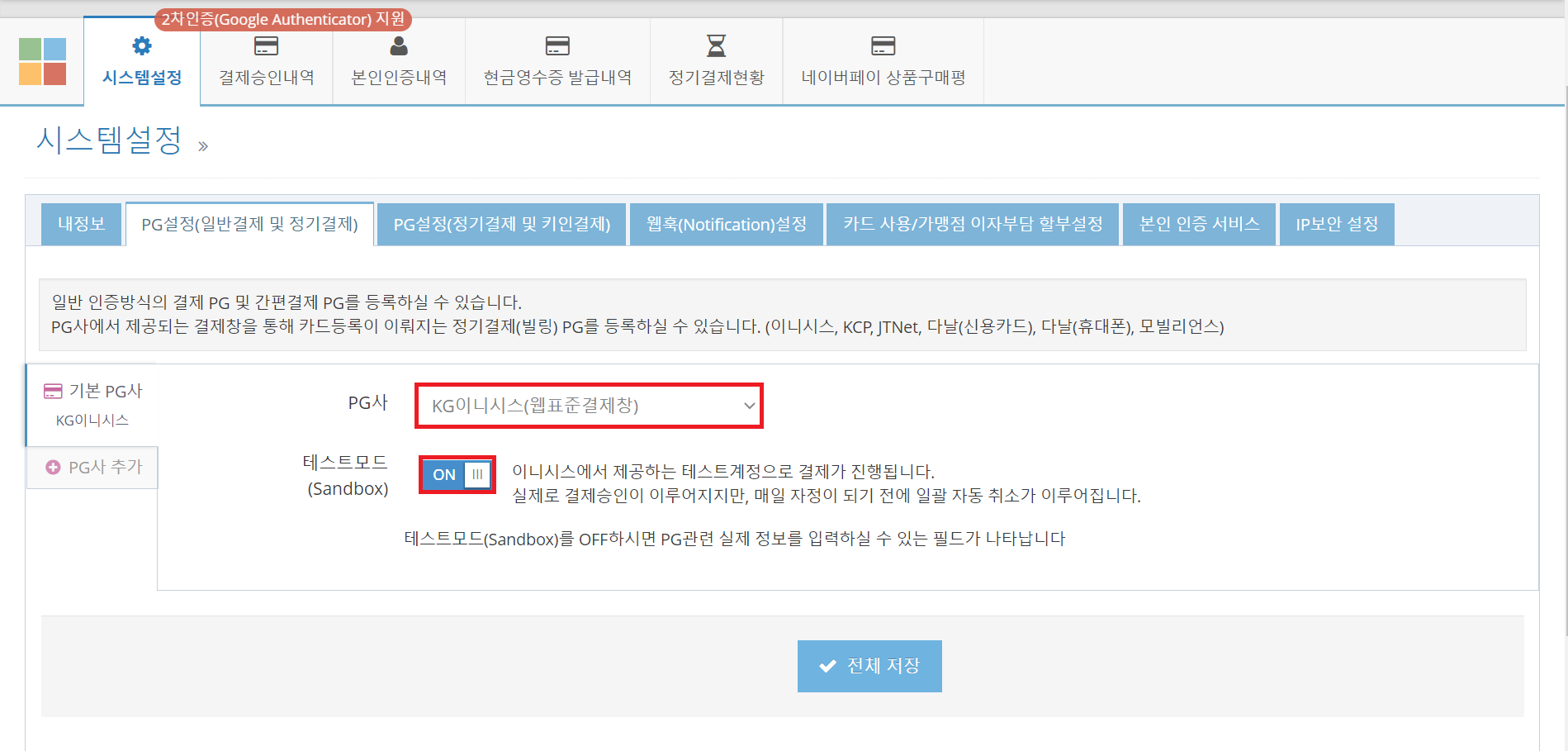 시스템설정 > PG설정 탭에 들어가면 네이버페이, 카카오페이, 페이코 등 여러가지가 있는데