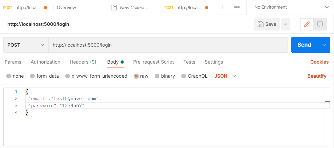 postman > 로그인 > workspace > collections > + 클릭 > post로 http://localhost:5000/login 하나 만들어준다 >