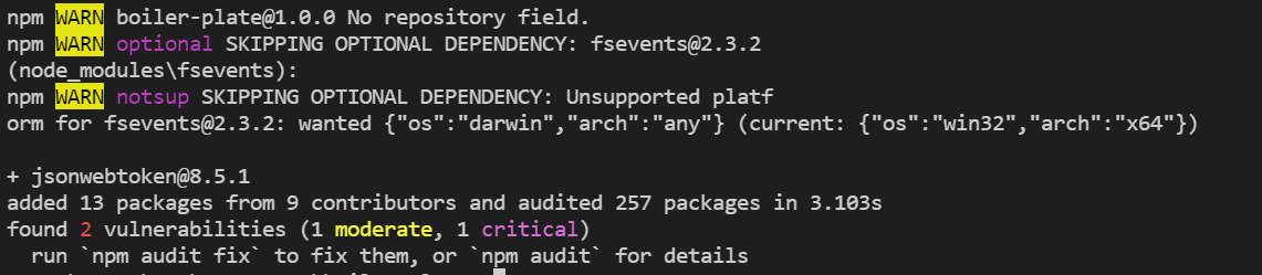 cookie-parser 설치에 성공하면 터미널에 아래와 같은 정보가 나온다.