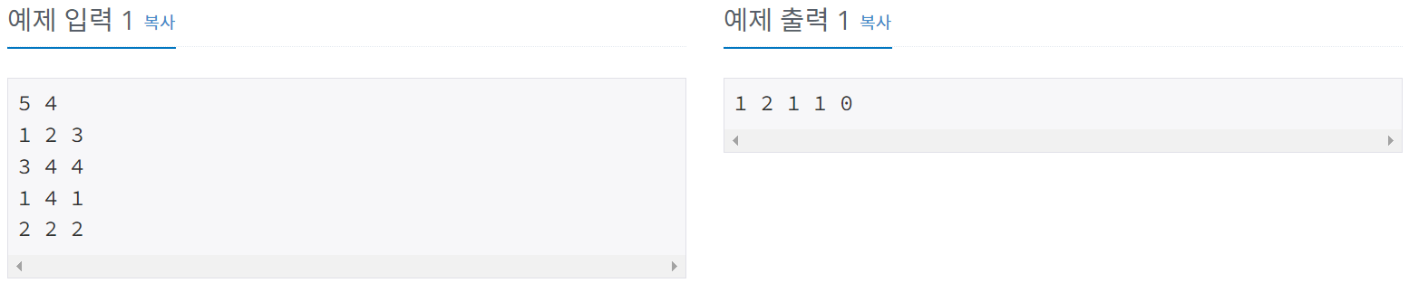 둘째 줄부터 M개의 줄에 걸쳐서 공을 넣는 방법이 주어진다. 각 방법은 세 정수 i j k로 이루어져 있으며, i번 바구니부터 j번 바구니까지에 k번 번호가 적혀져 있는 공을 넣는다는 뜻이다. 예를 들어, 2 5 6은 2번 바구니부터 5번 바구니까지에 6번 공을 넣는다는 뜻이다. (1 ≤ i ≤ j ≤ N, 1 ≤ k ≤ N)
