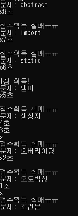 O, X 값을 입력받고 O일 때 1점을 획득, O가 아닌 다른 문자를 입력했을때는 점수 획득 실패시켰다.