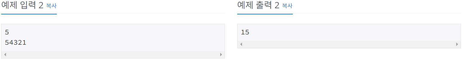 N개의 숫자가 공백 없이 쓰여있다. 이 숫자를 모두 합해서 출력하는 프로그램을 작성하시오.